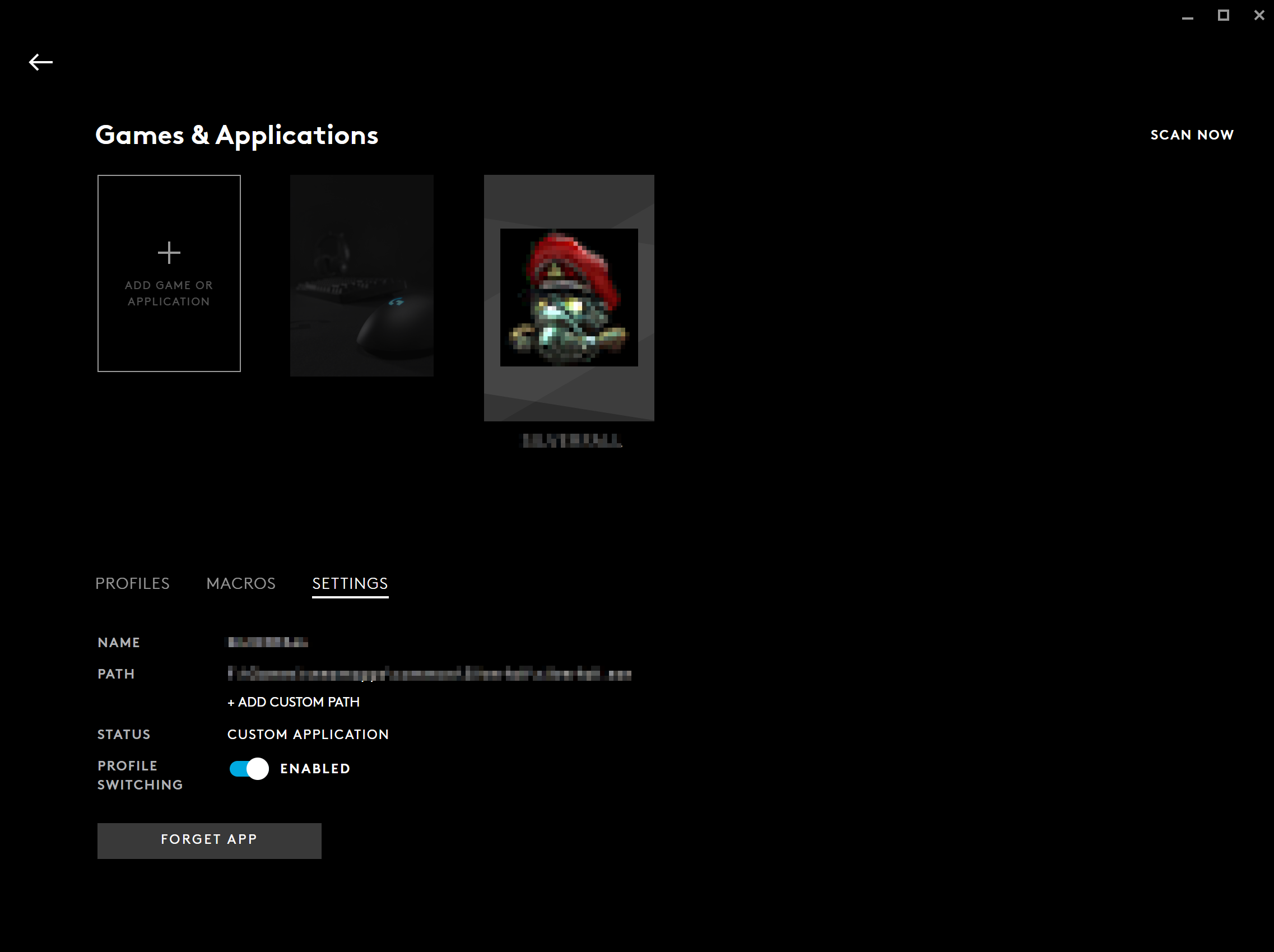 If you go in Manage profiles in GHUB and look under Games & Applications, you will notice some games already automatically being added to the list. If you click on the SETTINGS tab, you won’t see any button to FORGET APP like the following (that usually appear for custom added games):